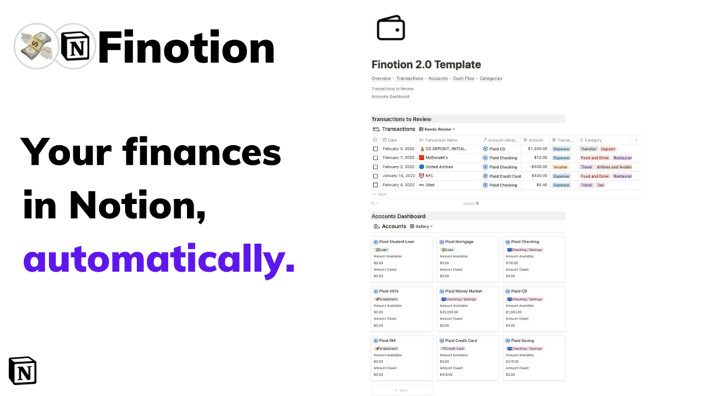 Finotion is the only finance tracker that automatically imports your transactions from your bank accounts and keeps them in sync with your Notion database.